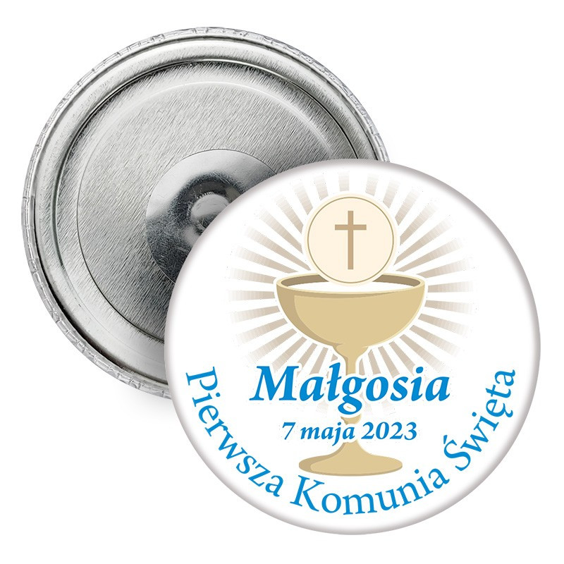 Magnes (okrągły, plastikowy) z imieniem oraz datą uroczystości- podziękowanie Komunia Święta.