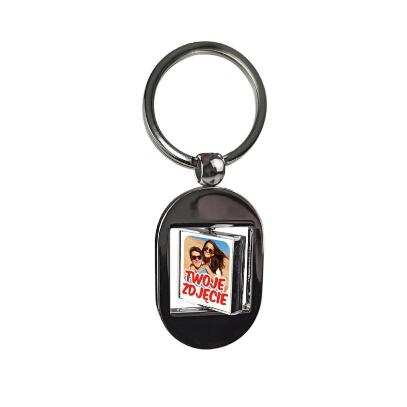 Elegancki ciężki, metalowy, obrotowy brelok z dwoma zdjęciami.