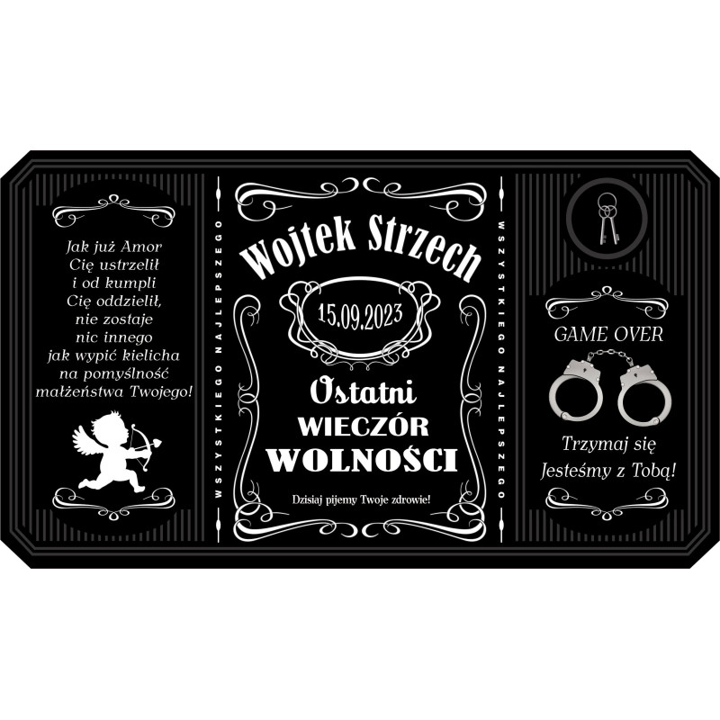 Etykieta na alkohol dla smakosza Jacka Daniels'sa. Etykieta w pełni personalizowana, wydrukowana na folii samoprzylepnej, dzięki temu bez problemu można ją samemu nakleić na butelkę. Dostosujemy ją oczywiście, również do pojemności tego pysznego trunku, wystarczy wybrać odpowiednią kombinację w zakładce PERSONALIZACJA PRODUKTU.