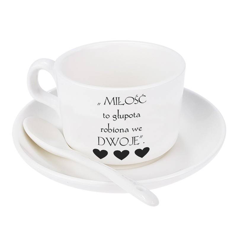 MediagrafFiliżanka 150 ml „Miłość to głupota robiona we dwoje” ❤️ – zabawny i romantyczny prezent dla zakochanych, par i nowożeńców. W komplecie ze spodkiem i łyżeczką, idealna na kawę we dwoje.