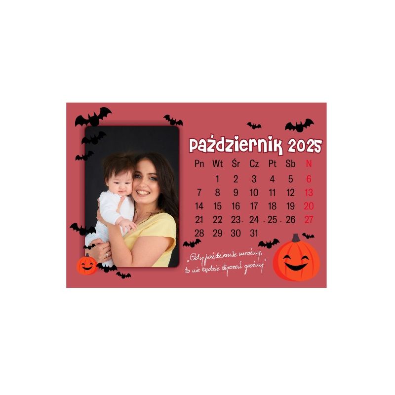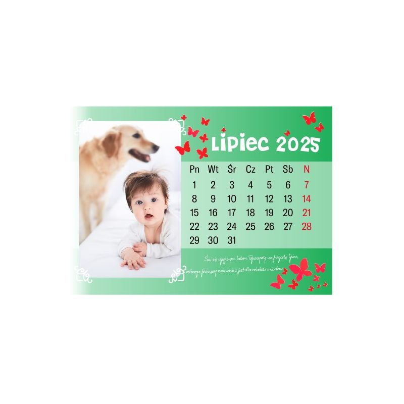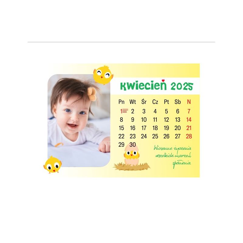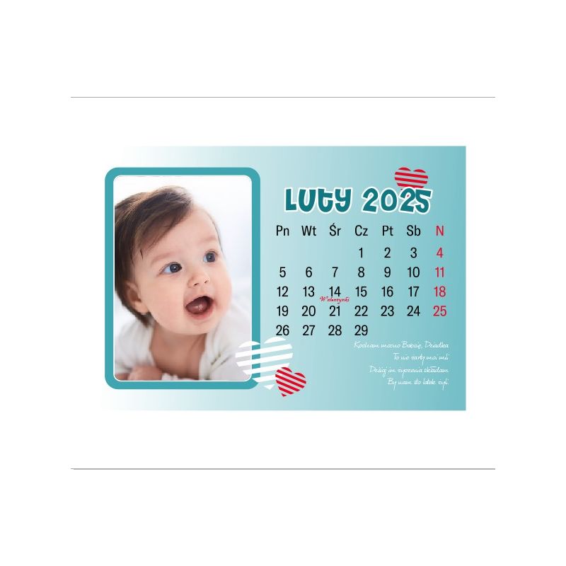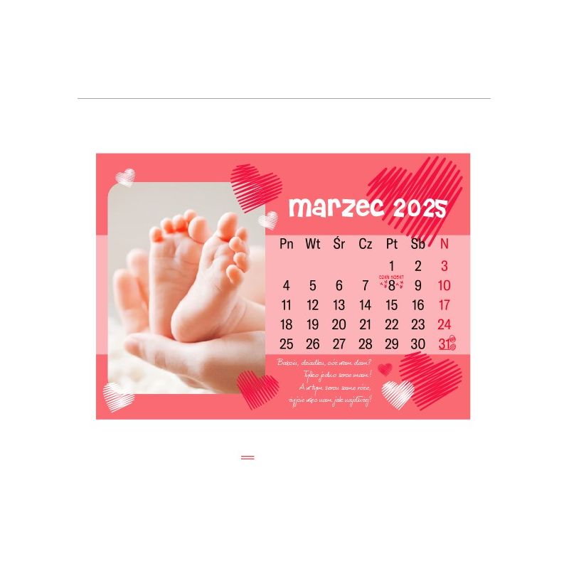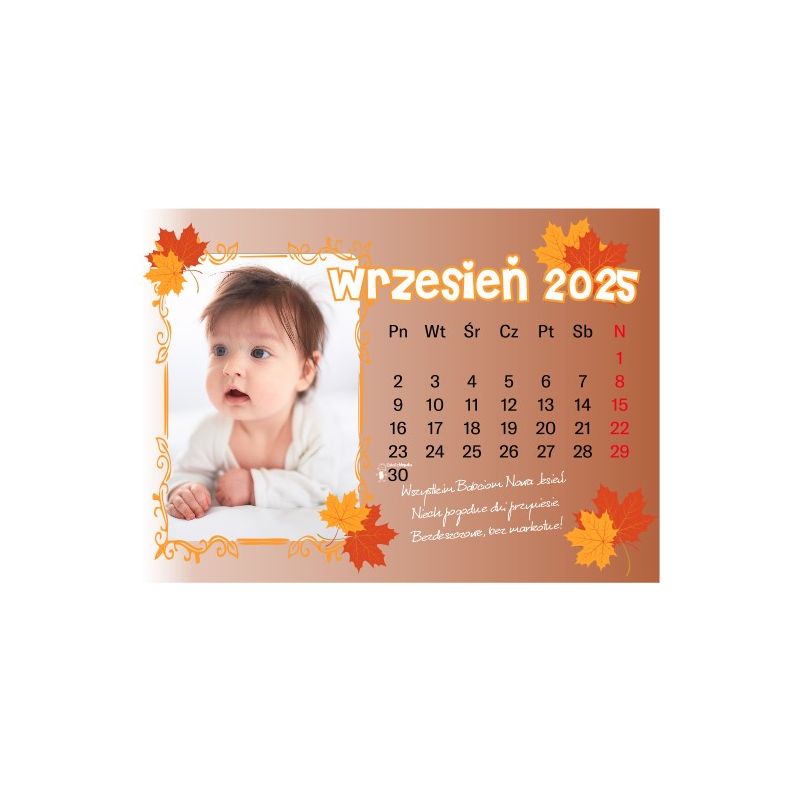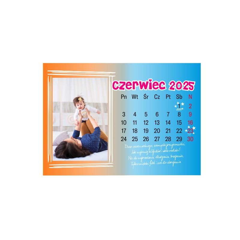 Personalizowany kalendarz z Twoimi zdjęciami - może stanowić wspaniały prezent dla bliskich. Foto-kalendarz składa się z 12 plansz na kolejne miesiące oraz okładki. Okładka jest wykonana z papieru o gramaturze 300g. Na kalendarzu umieścimy Państwa zdjęcia lub grafiki, które prosimy przesłać przez zakładkę PERSONALIZACJA PRODUKTU - po wgraniu zdjęć koniecznie kliknij przycisk ZAPISZ na dole strony pod polami do wstawienia zdjęć, dodaj produkt do koszyka i przejdź do realizacji zamówienia. W kalendarzu zostały zaznaczone dodatkowe święta oraz wierszyki dla babć i dziadków, a także powiedzenia związane z miesiącami. Przeznaczyliśmy, również miejsce na notatki.