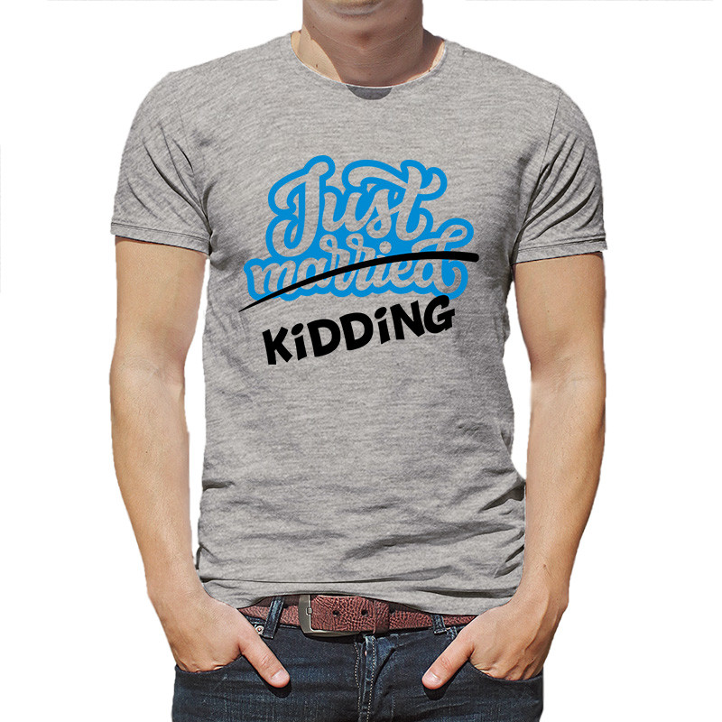 Zabawna koszulka dla mężczyzny na kawalerski "Just married kidding".