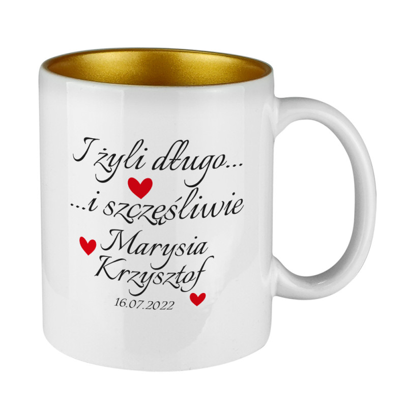 Kubek z perłowym środkiem specjalnie dla niej- I żyli długo i szczęśliwie- z imionami oraz datą ślubu.