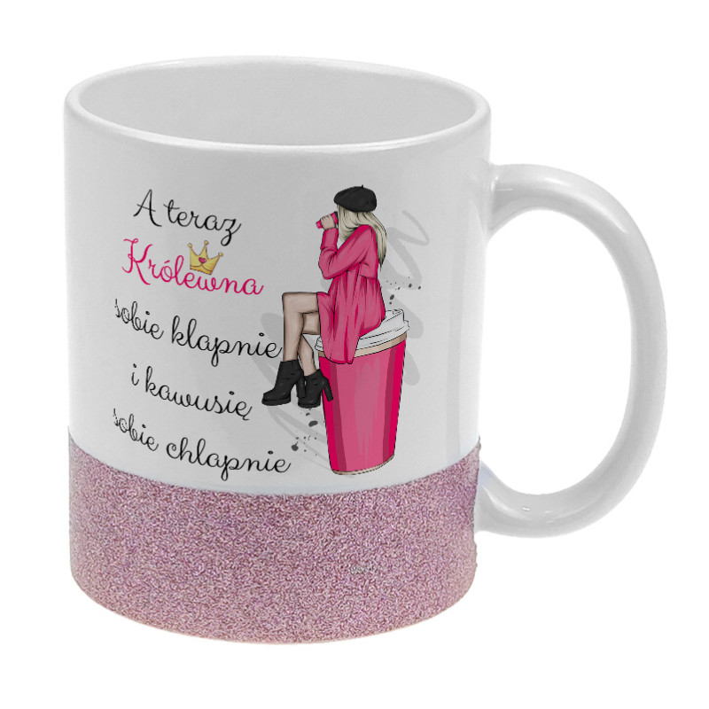 Kubek z brokatowym paskiem "A teraz królewna sobie klapnie i kawusię sobie chlapnie"- pasek złoty bądź różowy.