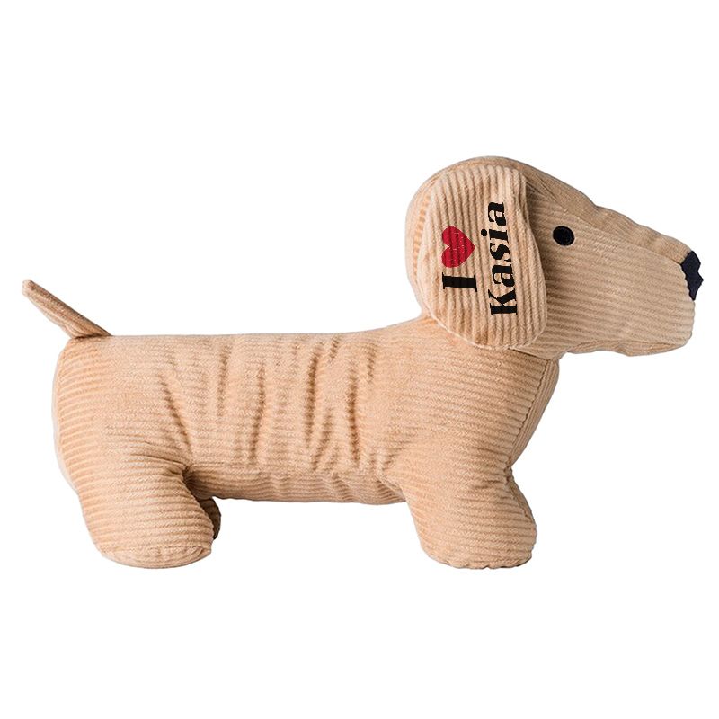 Duży piesek personalizowany z nadrukiem na uszku "I love + imię"- ok. 32cm.