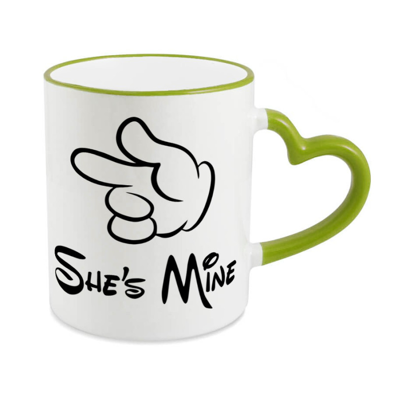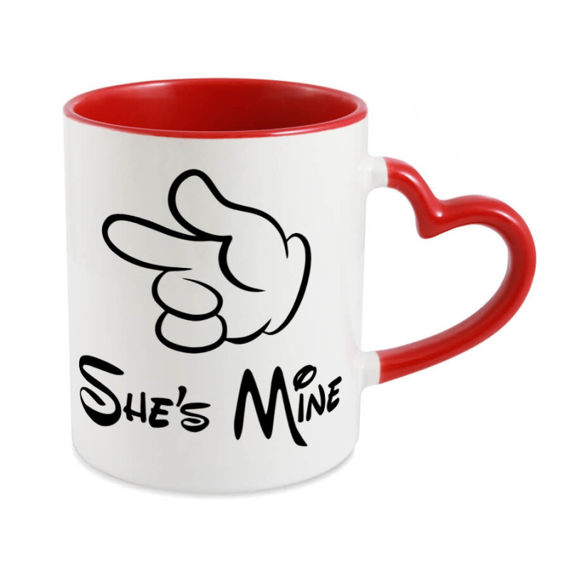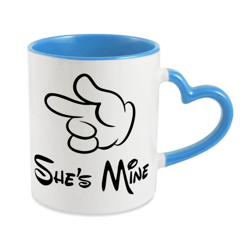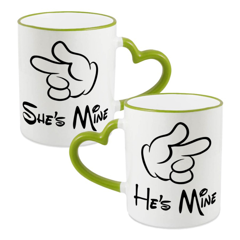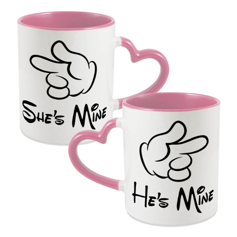 Zestaw Kubków z nadrukiem (sublimacja) "He's/ She's Mine". Idealny na prezent ślubny, bądź nagrodę w zabawach oczepinowych.