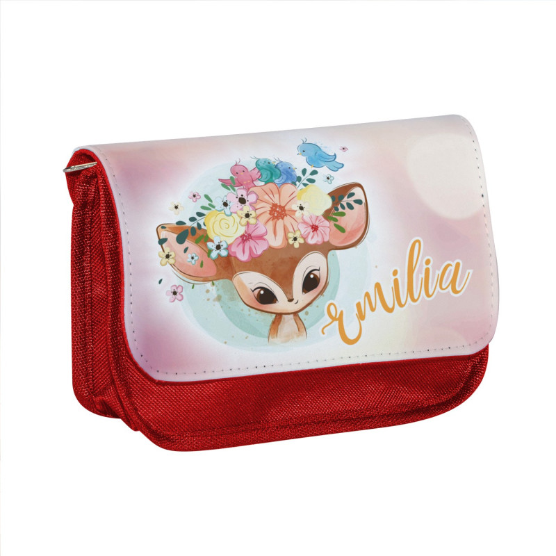 Piórnik personalizowany z imieniem dziecka z grafiką uroczej sarenki.