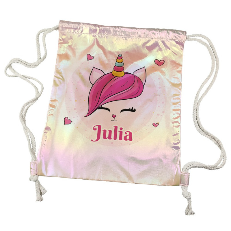 Worko-plecak holograficzny różowy z imieniem- Jednorożec różowy.