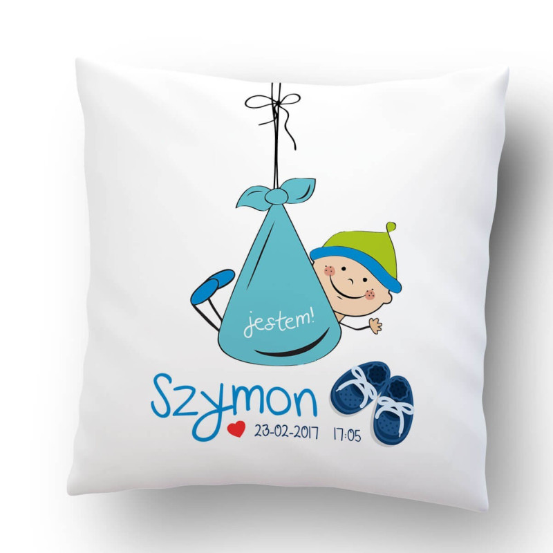 Poduszka personalizowana z okazji narodzin dziecka (chłopczyka) - gratulacje dla rodziców.