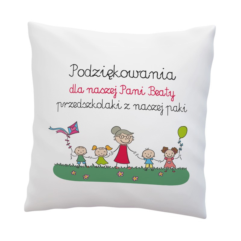 Pluszowa poduszka z napisem "Dla naszej Pani przedszkolaki z naszej paki" - super prezent dla nauczyciela - personalizowana.