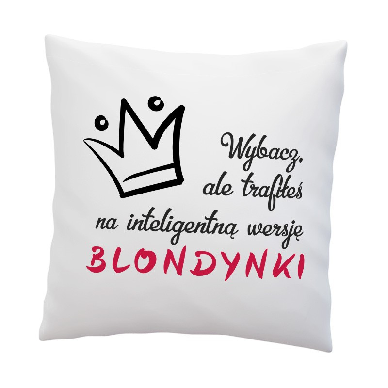 Super poduszka dla blondynki ze śmiesznym tekstem "Wybacz, ale trafiłeś na inteligentną wersję blondynki".