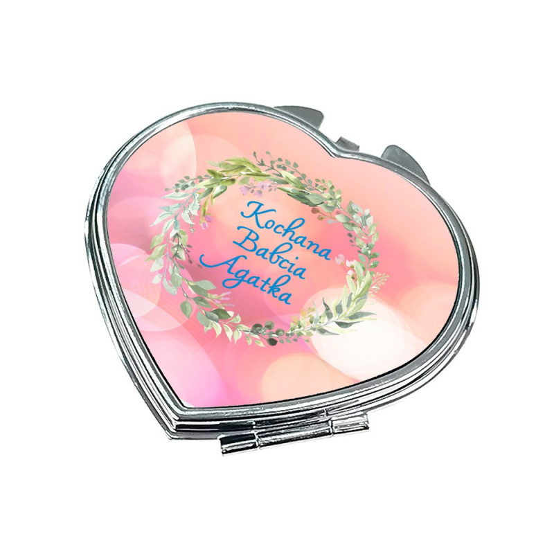 Szukasz prezentu dla Babci z okazji Dnia Babci? Metalowe kompaktowe, lusterko z nadrukiem grafiki oraz personalizacją imieniem będzie idealnym, unikalnym pomysłem.  Świetna dedykacja mile zaskoczy obdarowaną osobę. Wszak małe lusterko jest niezbędnym elementem wyposażenia kobiecej torebki. Lusterko pięknie zapakujemy w woreczek z organzy, a Ty już nie musisz myśleć o pakowaniu tylko je wręczysz. Personalizowane lusterko będzie wspaniałym pomysłem na prezent na Dzień Babci, ale także na wszelkie inne okazje: urodziny, imieniny, święta. Będzie super pamiątką na długie lata. Do kompletu dokupisz u nas kosmetyczkę z tym samym nadrukiem.