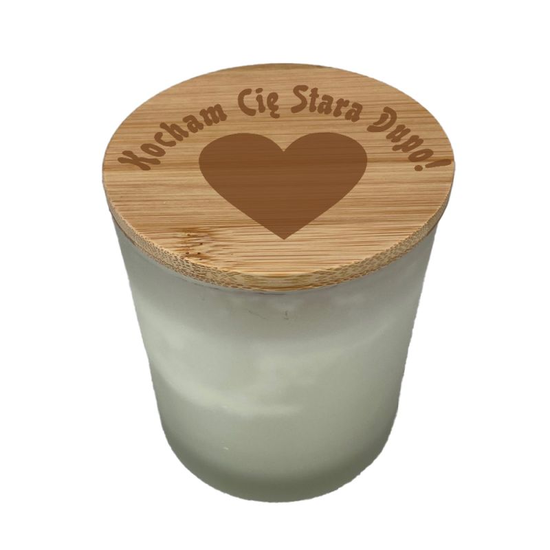 Duża świeczka zapachowa w szklanym słoiczku z bambusowym wieczkiem-"Kocham Cię Stara Dupo!" biała lub czarna.