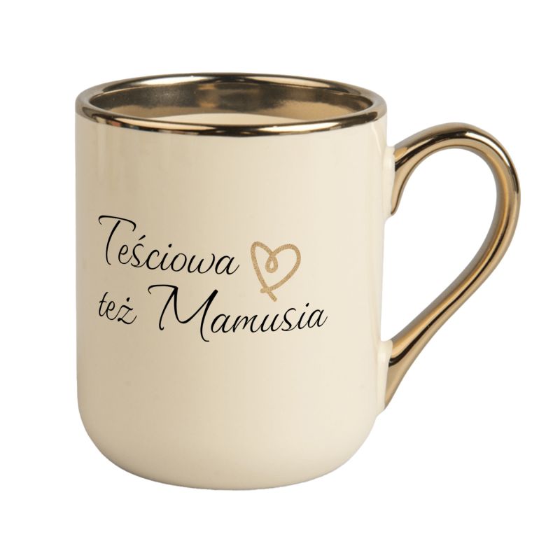 Kubek kawowy duży 330ml ze złotym uszkiem- "Teściowa też Mamusia".