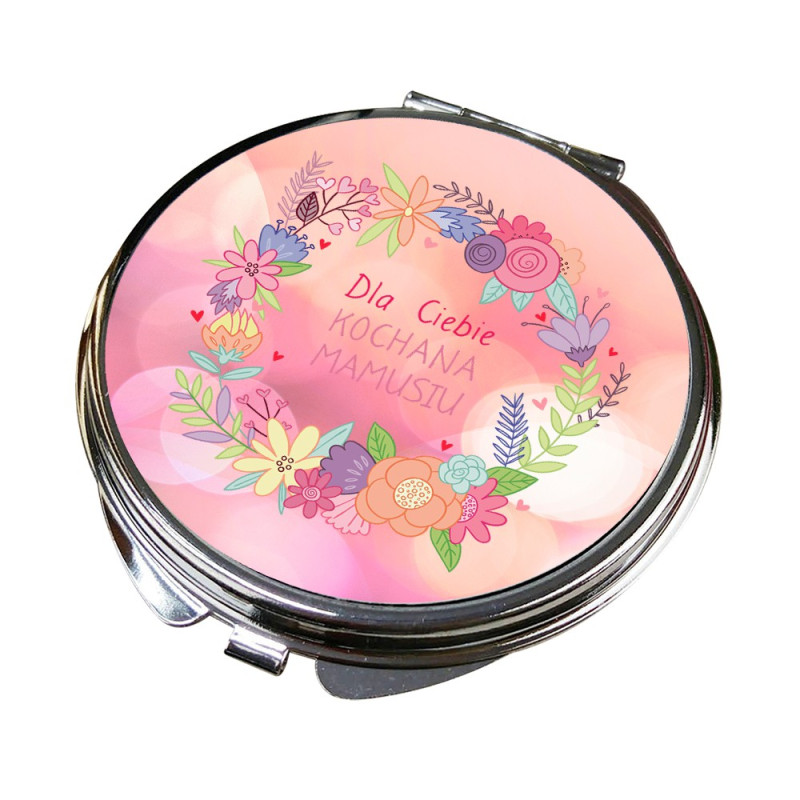 Szukasz prezentu dla Mamy z okazji Dnia Matki? Metalowe kompaktowe, lusterko z nadrukiem grafiki oraz personalizacją imieniem będzie idealnym, unikalnym pomysłem.  Świetna dedykacja mile zaskoczy obdarowaną osobę. Wszak małe lusterko jest niezbędnym elementem wyposażenia kobiecej torebki. Lusterko pięknie zapakujemy w woreczek z organzy, a Ty już nie musisz myśleć o pakowaniu tylko je wręczysz. Lusterko będzie wspaniałym pomysłem na prezent na Dzień Mamy, ale także na wszelkie inne okazje: urodziny, imieniny, święta. Będzie super pamiątką na długie lata. Do kompletu dokupisz u nas kosmetyczkę z tym samym nadrukiem.