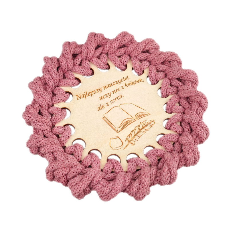 Różowa pleciona podkładka pod kubek z grawerem specjalnie dla nauczyciela z cytatem.