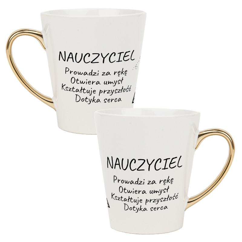 Biały kubek latte ze złotym uchwytem dla nauczyciela z sentencją.