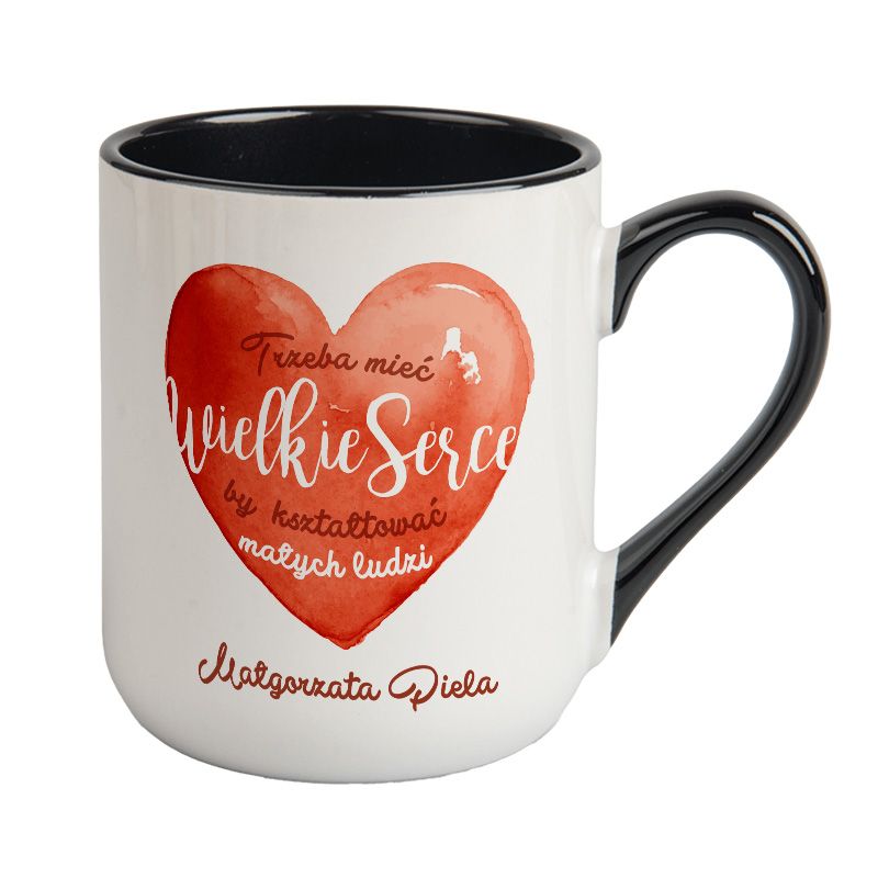Kubek kawowy duży 330ml z kolorowym uszkiem i wnętrzem- Wielkie Serce Nauczyciela- personalizacja.
