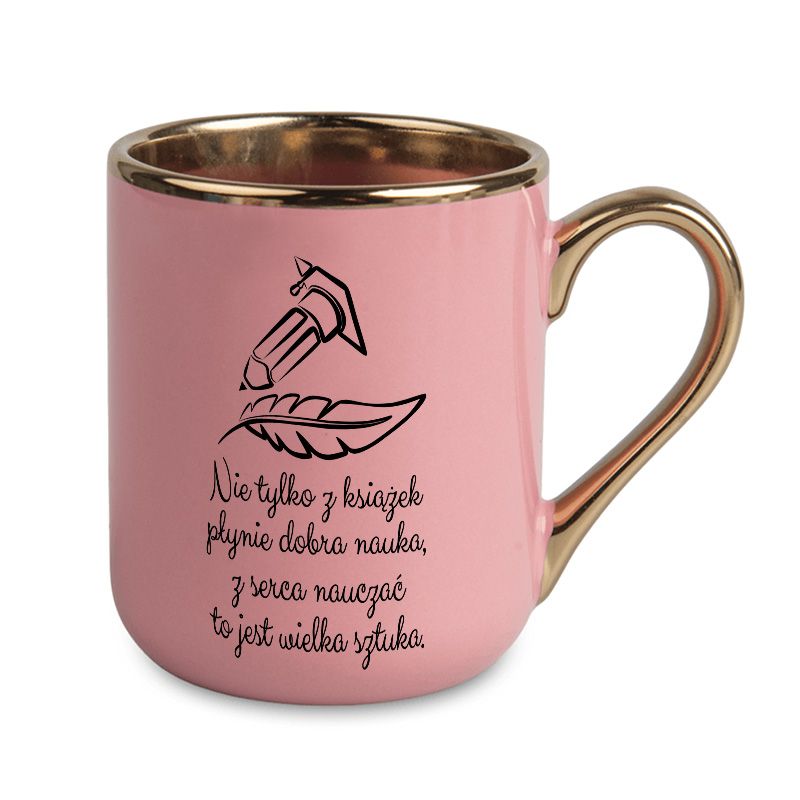 Kubek kawowy duży 330ml ze złotym uszkiem dla nauczyciela- "Nie tylko z książek"- pióro.