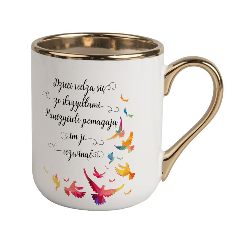 Kubek kawowy duży 330ml ze złotym uszkiem dla nauczyciela- "Dzieci ze skrzydłami".