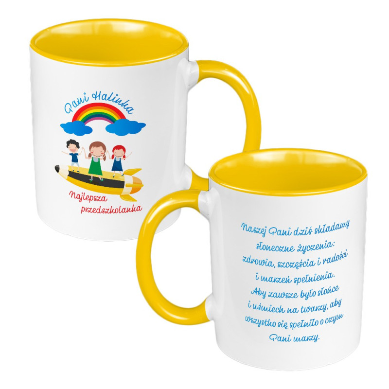Kubek 330 ml kolorowy na dzień nauczyciela "Pani Halinka najlepsza przedszkolanka" - personalizacja.