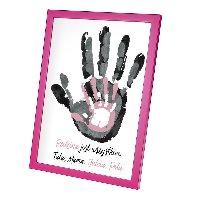 Plakat zawiera trzy odciski dłoni: czarny, różowy i biały lub czarny, niebieski i biały do wyboru.