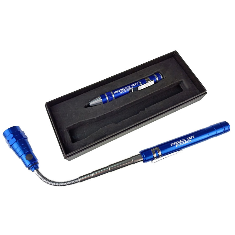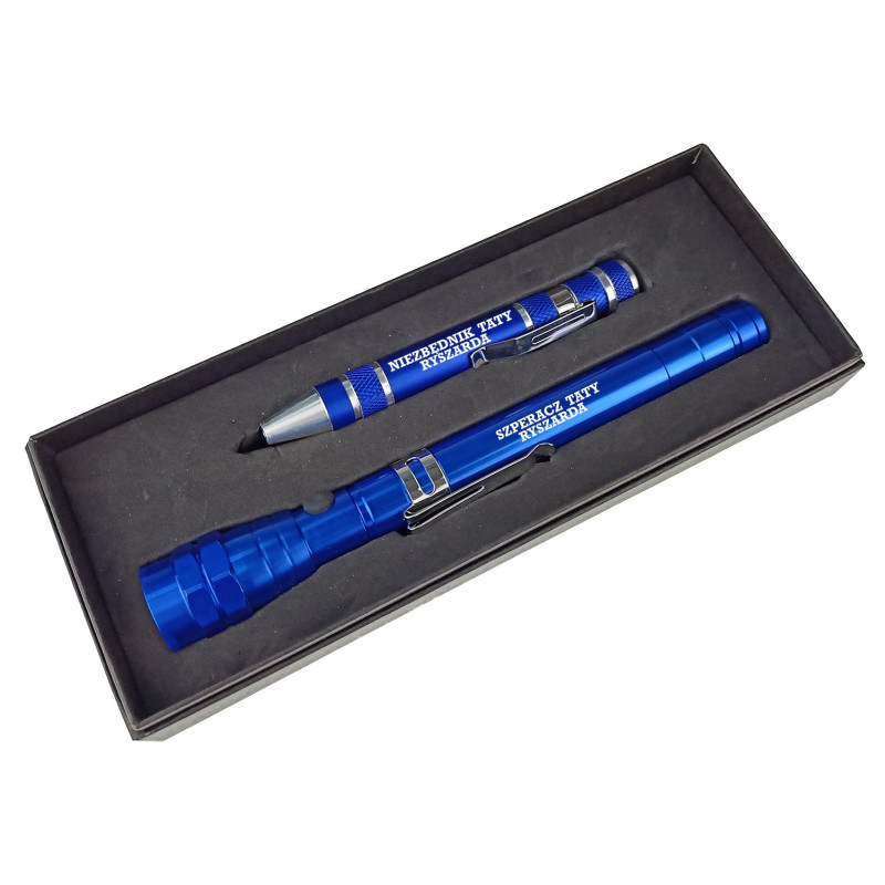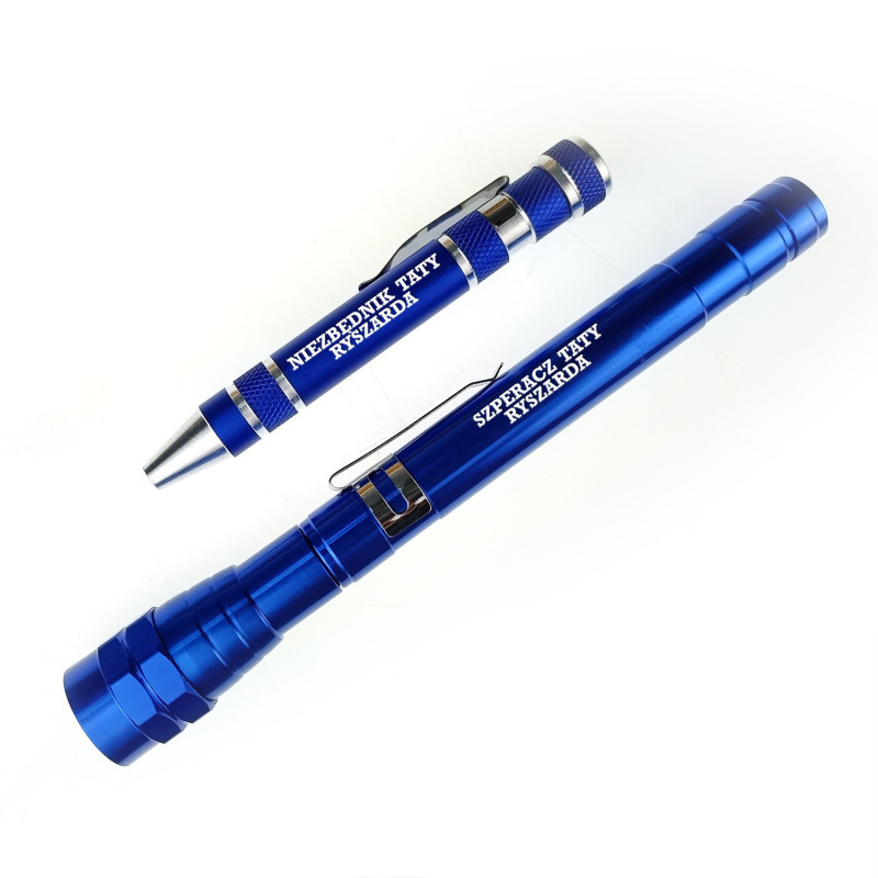 Świetnie sprawdzi się dla taty, dziadka, kolegi czy partnera na każdą okazję. Personalizowany grawer na każdym z elementów uczyni zestaw wyjątkowym, a obdarowana osoba długi czas będzie cieszyć się takim prezentem. Zestaw świetnie sprawdzi się jako podręczne narzędzie, ponieważ zajmuje bardzo mało miejsca, z powodzeniem zmieści się w kuchennej szufladzie, dzięki temu nie będą już koniecznie wizyty w garażu, piwnicy, a potrzebne kompaktowe narzędzie będzie zawsze pod ręką. Oprócz latarki, która bardzo dobrze świeci, zestaw zawiera 6 końcówek śrubokrętów, które na pewno przydadzą się w każdym domu. Napis możesz zmienić wg upodobań, pamiętaj tylko, że ilość wyrazów i ich długość nie może być większa niż na wzorze.