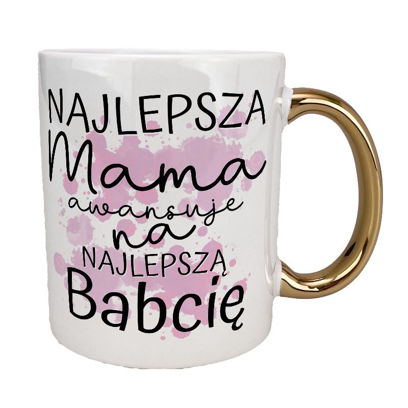 Kubek 330 ml biały ze złotym uszkiem oraz z grafiką "Najlepsza Mama awansuje na Najlepszą Babcię".
