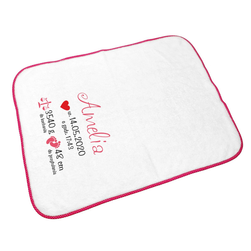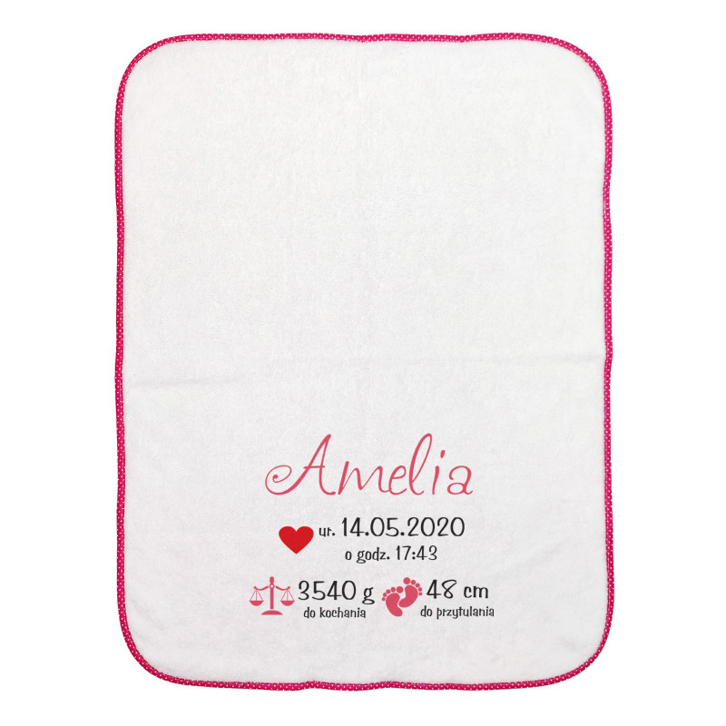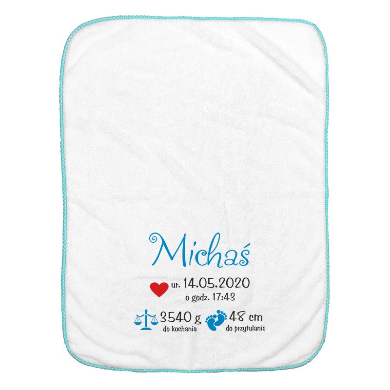 Prezent ten może stanowić wspaniały podarunek dla młodych rodziców z okazji narodzin ich dziecka. Imię oraz data urodzenia będą im zawsze przypominać te wspaniałe chwile. Milutki i mięciutki kocyk będzie idealny zarówno do wózka jak i łóżeczka na wiosenne i letnie dni. Kolorowy nadruk oraz ozdobna lamówka dodają uroku.