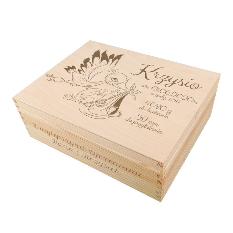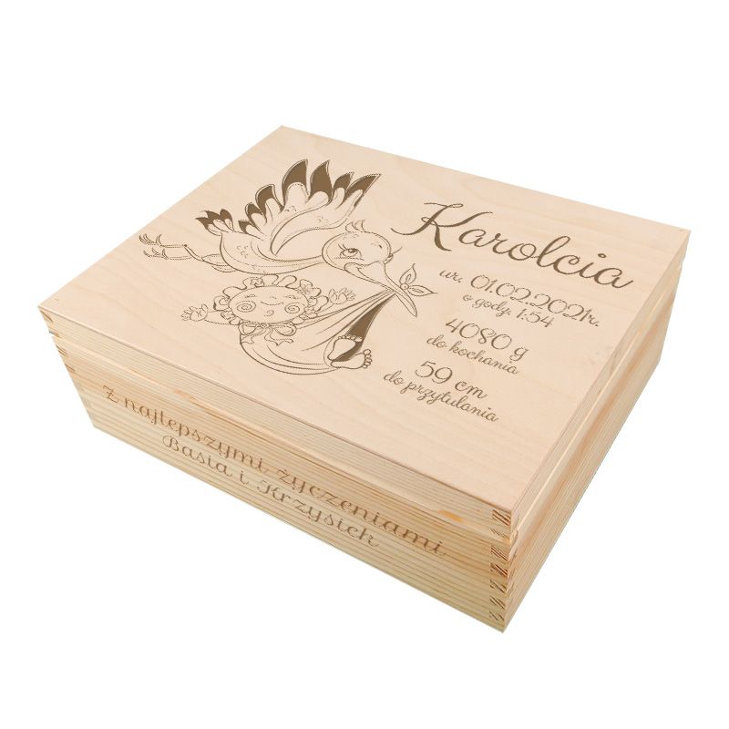 Świetna szkatułka z okazji narodzin dziecka. To prezent nie tylko dla Rodziców, ale i dla dziecka, ponieważ pamiątki, które zostaną tam schowane będą wszystkim przez lata przypominać pierwsze dni i lata maleństwa na świecie. Wewnątrz przegródki do umieszczenia przedmiotów związanych z narodzinami malucha- możesz kupić śmieszne gadżety sam, a też możesz pozwolić wypełnić je świeżo upieczonym rodzicom. Pudełko wyścielone jest wiórkami drzewnymi. Do pudełka pakujesz drobne gadżety i prezent z okazji narodzin, a zarazem pamiątka na całe życie gotowy.