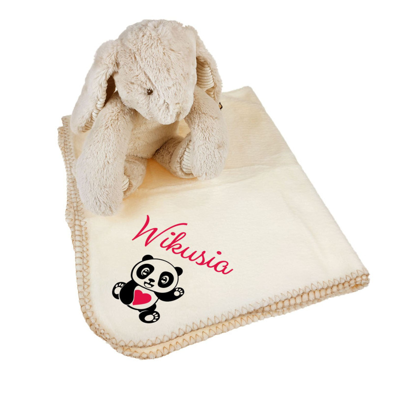 Królik trzymający koc między łapkami z imieniem dziecka- narodziny dziecka- panda.