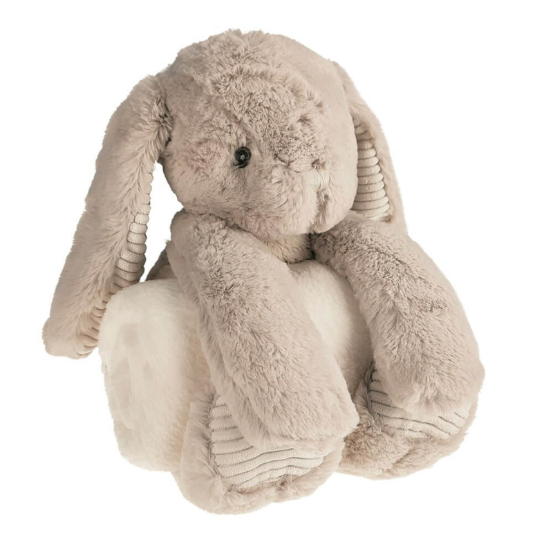 Królik trzymający koc między łapkami z imieniem dziecka- prezent na narodziny.