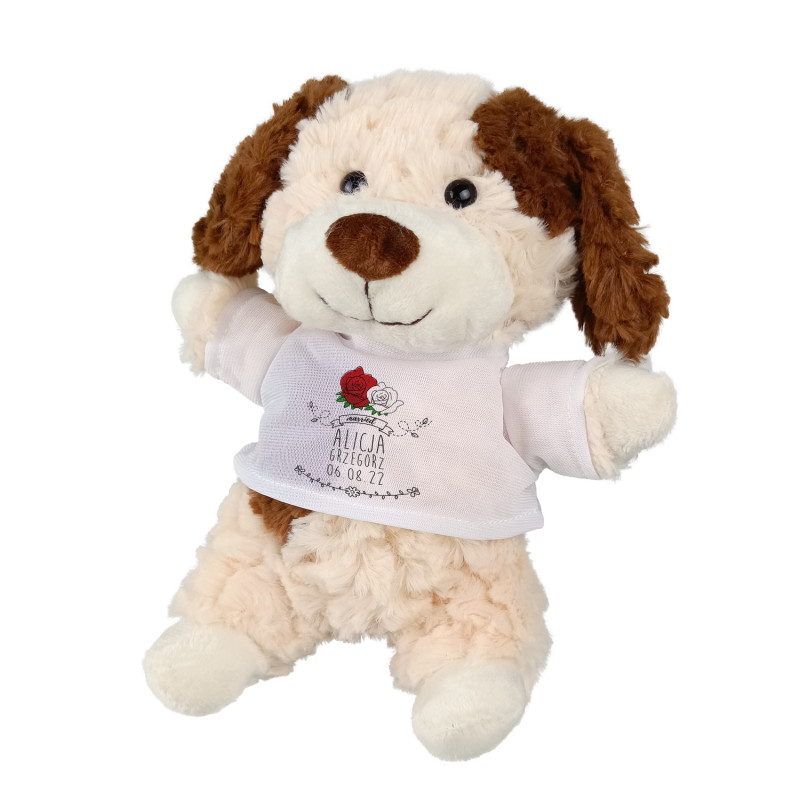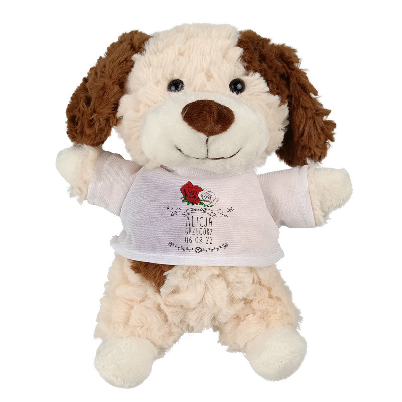 Puszysty piesek z grafiką "Róża z imionami i datą ślubu"- 18cm.