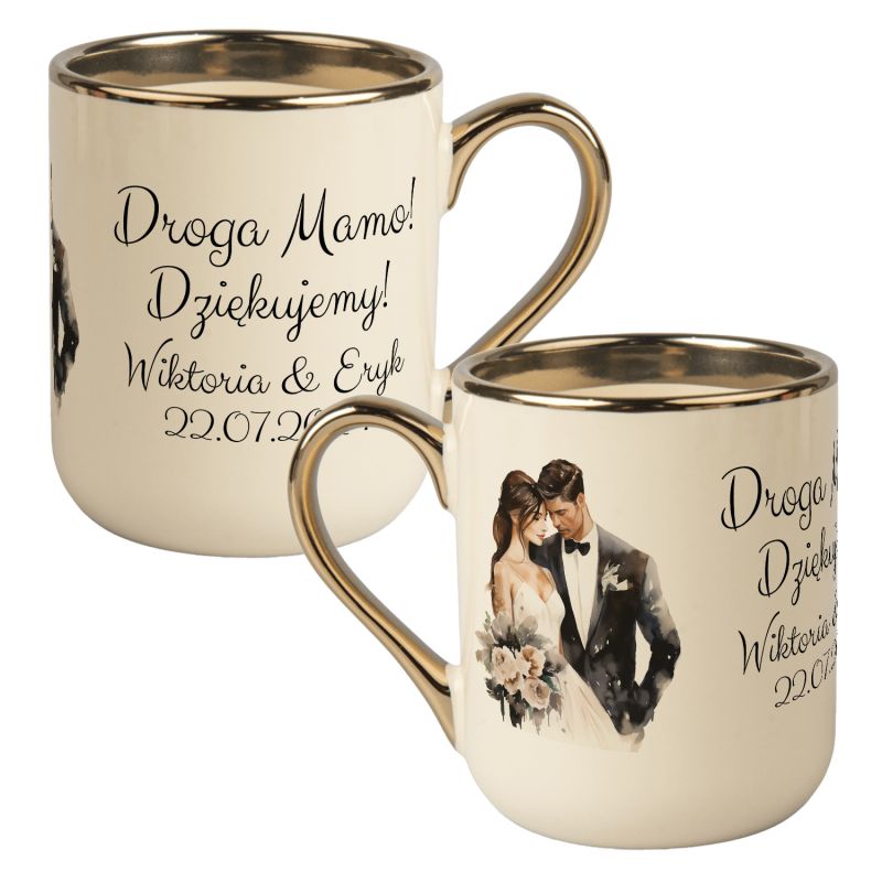 Nie zapomnij zapisać swojej personalizacji, aby móc dodać ją do koszykaKubek kawowy duży 330ml ze złotym uszkiem- Droga Mamo, dziękujemy!- prezent ślubny dla Rodziców.