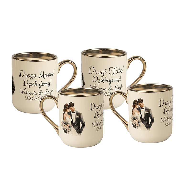 Zestaw kubków kawowych dużych 330ml ze złotym uszkiem- Droga Mamo, Drogi Tato, dziękujemy!- prezent ślubny dla Rodziców.