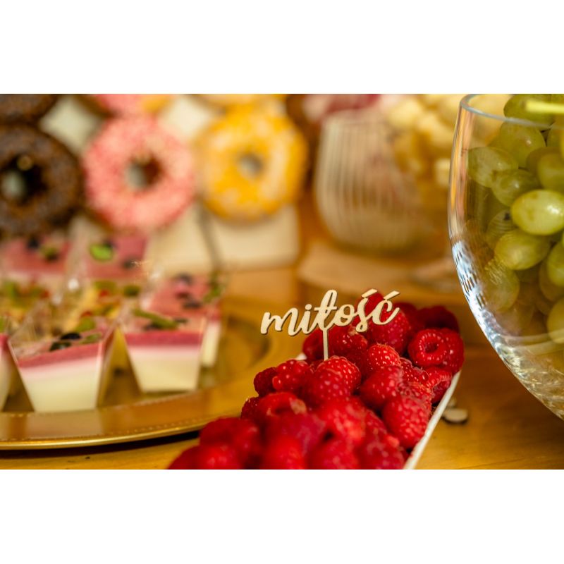 Dekoracyjne malutkie topperki z napisem "miłość"- piękna dekoracja ślubna na słodki stół- eko ze sklejki.
