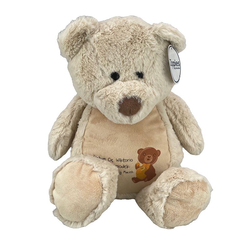 Beżowy miś ok. 32 cm z wyciąganym brzuszkiem oraz z nadrukiem: Kocham Cię jak misio miodek.