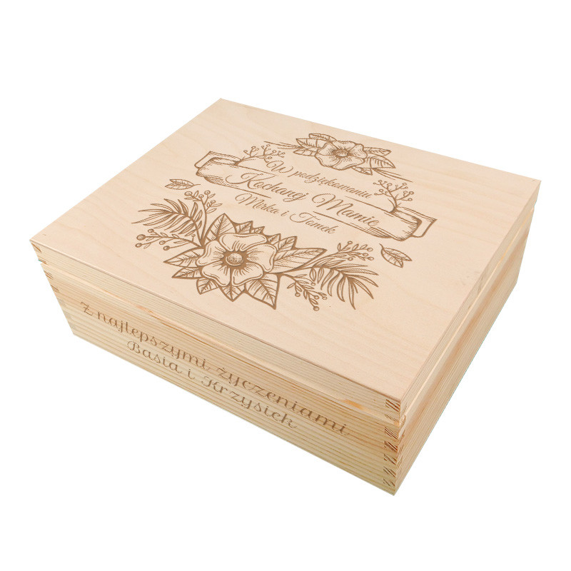 Świetna szkatułka na urodziny, imieniny, Walentynki, święta czy inne okazje. Na wieczku dedykacja dla mamy. Wewnątrz przegródki do umieszczenia drobiazgów. Boczna podłużna przegródka pomieści wódkę małpkę, perfumy czy inne bibeloty, które lubią kobiety. Pudełko wyścielone jest wiórkami drzewnymi. Etykietki drewniane mają zawiązane słodkie kokardki różowe, bądź naturalne - wyboru dokonasz w zakładce PERSONALIZACJA PRODUKTU - koniecznie naciśnij zapisz i dopiero dodaj produkt do koszyka.