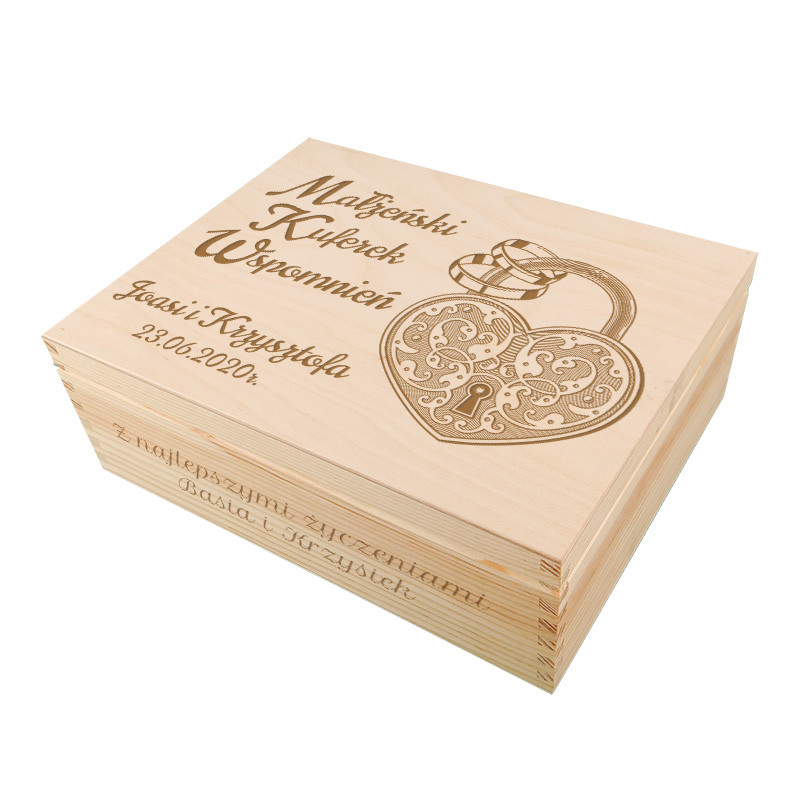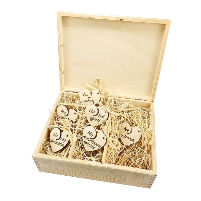 Świetna szkatułka na ślub. Z boku pudełka życzenia. Wewnątrz przegródki do umieszczenia śmiesznych przedmiotów związanych z wejściem w związek małżeński. Pudełko wyścielone jest wiórkami drzewnymi. Etykietki drewniane mają zawiązane słodkie kokardki. Do pudełka pakujesz drobne gadżety i prezent na ślub, a zarazem pamiątka na całe życie gotowy.