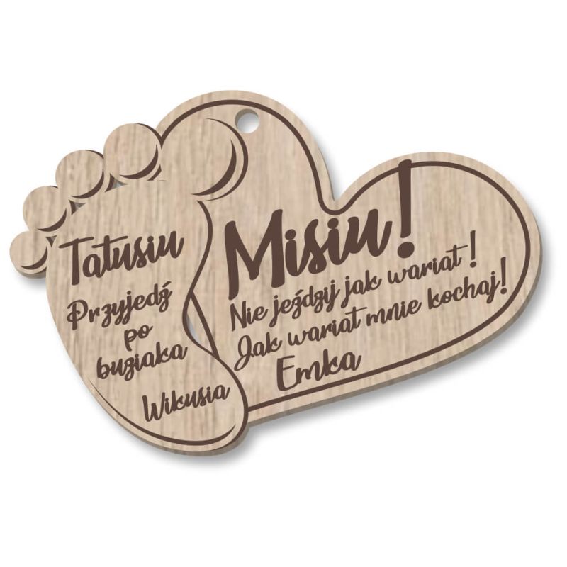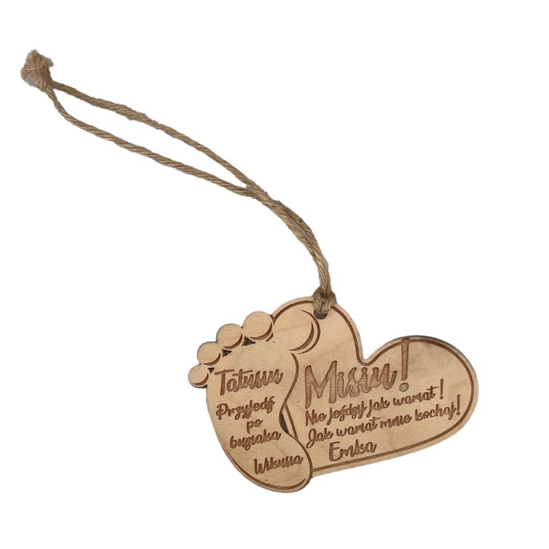 Istnieją takie przedmioty, które na długo pozostaną w naszych wspomnieniach. Jedną z takich rzeczy może być brelok dla taty. Brelok dla kierowcy jest gustownym elementem dekoracyjnym, który można powiesić na lusterko. Zawieszka z grawerem to idealny pomysł na skromny lecz wartościowy upominek dla każdego mężczyzny, który niebawem zostanie ojcem. To również oryginalny prezent na dzień ojca od dziecka, które jeszcze znajduje się w brzuszku mamy. Breloczek z grawerem nie tylko będzie przydatny na co dzień, ale także może wywoływać miłe wspomnienia. Zawieszka do auta powinna być wyjątkowa i dobrze widoczna. Ten brelok grawerowany został wykonany z trwałego i wytrzymałego drewna dzięki czemu, długo będzie spełniał swoją funkcję i przyciągał uwagę swoim nietuzinkowym i ponadczasowym designem. Nie bez powodu został zaprojektowany on w kształcie serduszka. Takie breloki samochodowe z grawerem posiadają również zawieszkę z gustownego sznurka parcianego. Grawer został naniesiony z jednej strony.