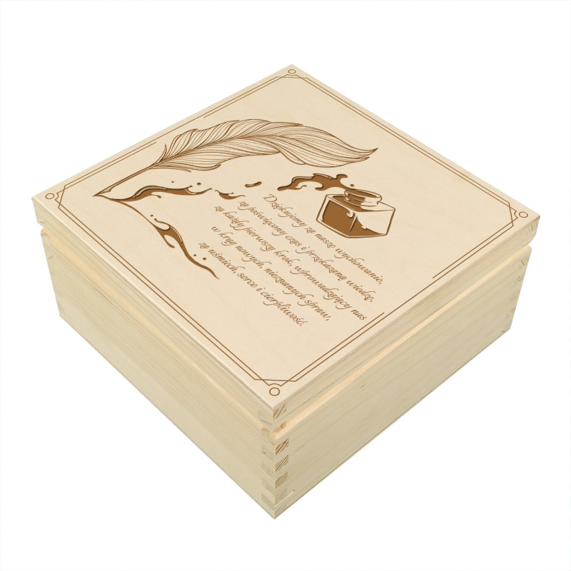Jeśli chcesz podarować nauczycielowi wspaniałą pamiątkę, której na pewno będzie używał, to pudełko z herbatą będzie super upominkiem. Świetnie sprawdzi się na dzień nauczyciela oraz zakończenie roku jako podziękowanie za całoroczny trud wychowawczy. Po zużyciu herbaty może być pojemnikiem na drobiazgi. Wspaniałe podziękowania na pewno spodobają się każdemu belfrowi. Wystarczy dodać herbatę i prezent gotowy. Lepszy niż tradycyjne kwiaty, które często na drugi dzień prezentują się średnio. Z boku herbaciarki możemy umieścić grawer imienia, bądź nazwy klasy czy grupy, dzięki czemu Twoje pudełko będzie całkowicie wyjątkowe.