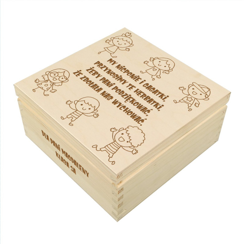 Jeśli chcesz podarować nauczycielowi wspaniałą pamiątkę, której na pewno będzie używał, to pudełko z herbatą będzie super upominkiem. Świetnie sprawdzi się na dzień nauczyciela oraz zakończenie roku jako podziękowanie za całoroczny trud wychowawczy. Po zużyciu herbaty może być pojemnikiem na drobiazgi. Wspaniałe podziękowania na pewno spodobają się każdemu belfrowi. Wystarczy dodać herbatę i prezent gotowy. Lepszy niż tradycyjne kwiaty, które często na drugi dzień prezentują się średnio. Z boku herbaciarki możemy umieścić grawer imienia, bądź nazwy klasy czy grupy, dzięki czemu Twoje pudełko będzie całkowicie wyjątkowe.
