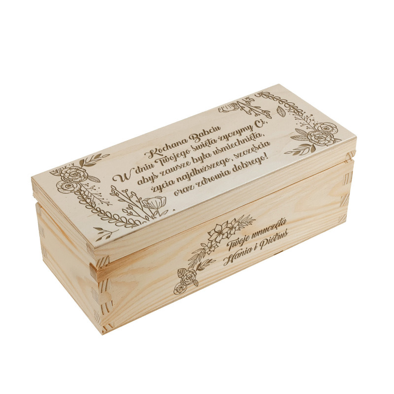 Jeśli chcesz podarować babci wspaniałą pamiątkę, której na pewno będą używać, to pudełko z herbatą będzie super upominkiem. Świetnie sprawdzi się na dzień babci, urodziny czy święta jako podziękowanie za miłość. Po zużyciu herbaty może być pojemnikiem na drobiazgi. Życzenia z personalizacją imionami wnuków na pewno zachwycą każdą babcię. Wystarczy dodać herbatę i prezent gotowy. Lepszy niż tradycyjne kwiaty, które często na drugi dzień prezentują się średnio. Z boku herbaciarki możemy umieścić grawer imienia, dzięki czemu Twoje pudełko będzie całkowicie wyjątkowe.