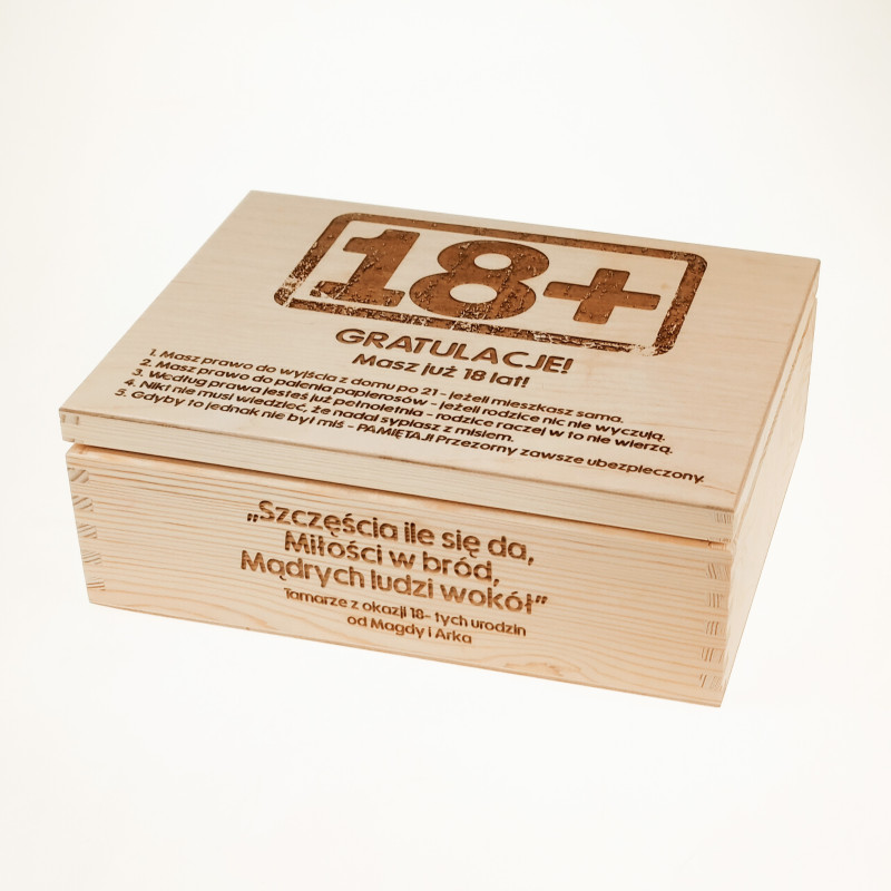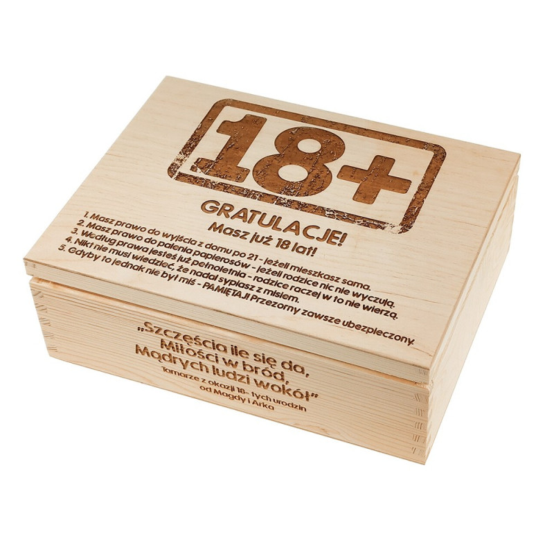 Świetna szkatułka na 18-ste urodziny. Na wieczku życzenia. Wewnątrz przegródki do umieszczenia śmiesznych przedmiotów związanych z wejściem w pełnoletność. Pudełko wyścielone jest wiórkami drzewnymi. Etykietki drewniane mają zawiązane słodkie kokardki różowe, bądź naturalne - wyboru dokonasz w zakładce PERSONALIZACJA PRODUKTU - koniecznie naciśnij zapisz i dopiero dodaj produkt do koszyka.