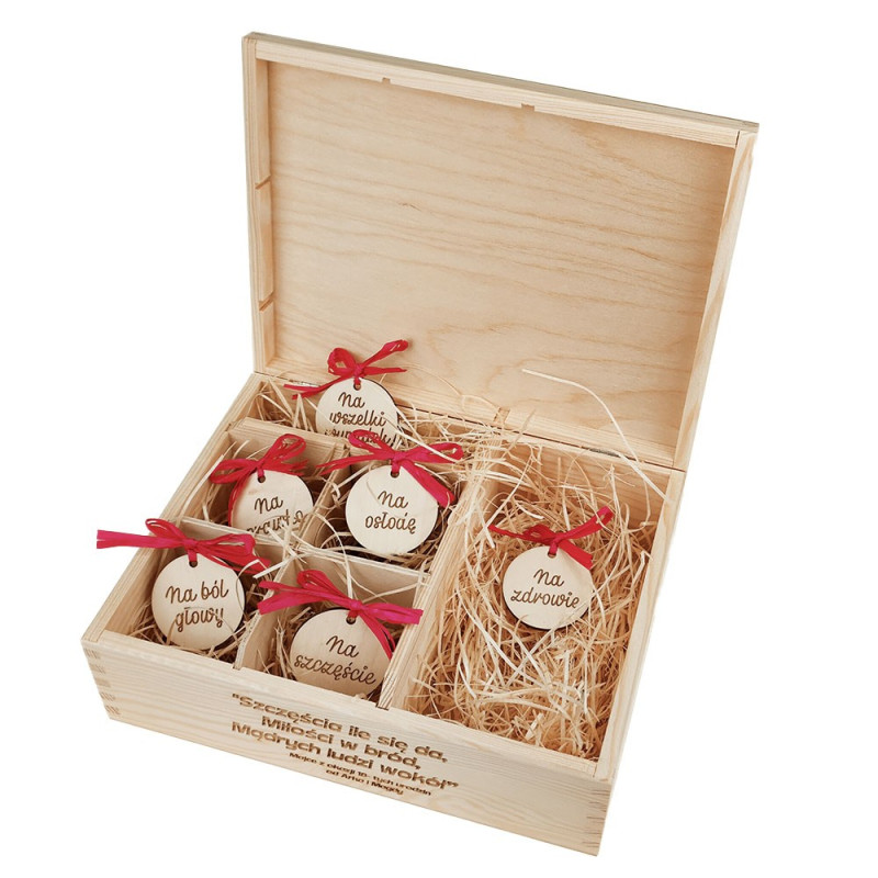 Świetna szkatułka na 18-ste urodziny. Na wieczku życzenia. Wewnątrz przegródki do umieszczenia śmiesznych przedmiotów związanych z wejściem w pełnoletność. Pudełko wyścielone jest wiórkami drzewnymi. Etykietki drewniane mają zawiązane słodkie kokardki różowe, bądź naturalne - wyboru dokonasz w zakładce PERSONALIZACJA PRODUKTU - koniecznie naciśnij zapisz i dopiero dodaj produkt do koszyka.