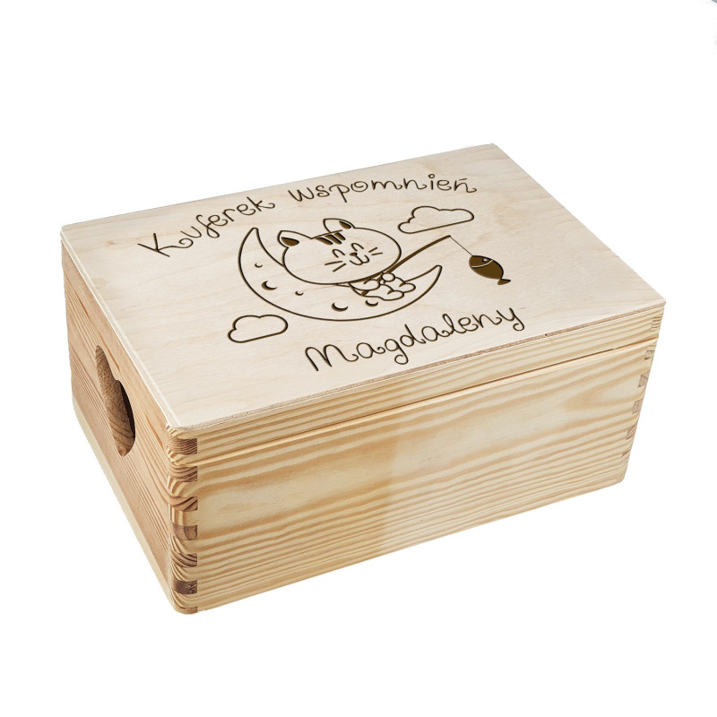 Świetnie sprawdzi się jako prezent dla małej królewny. Personalizowany grawer będzie wspaniałą pamiątką, którą na pewno cała rodzina na długo zapamięta. Duża powierzchnia skrzynki wspomnień umożliwi schowanie drobiazgów, które będą przypominać o tej pięknej chwili. Zabawna, wygrawerowana grafika kotka spodoba się każdej małej dziewczynce lub chłopcu. Pudełko wspomnień będzie towarzyszyć przez długi czas i pięknie ozdobi pokój naszej córeczki.