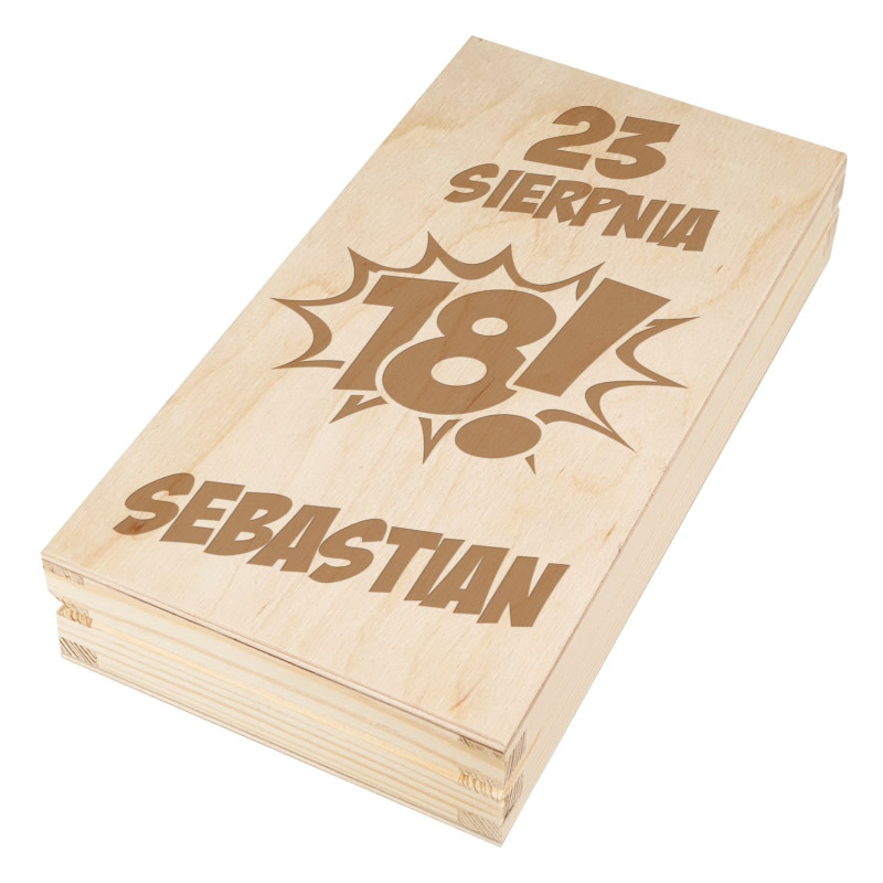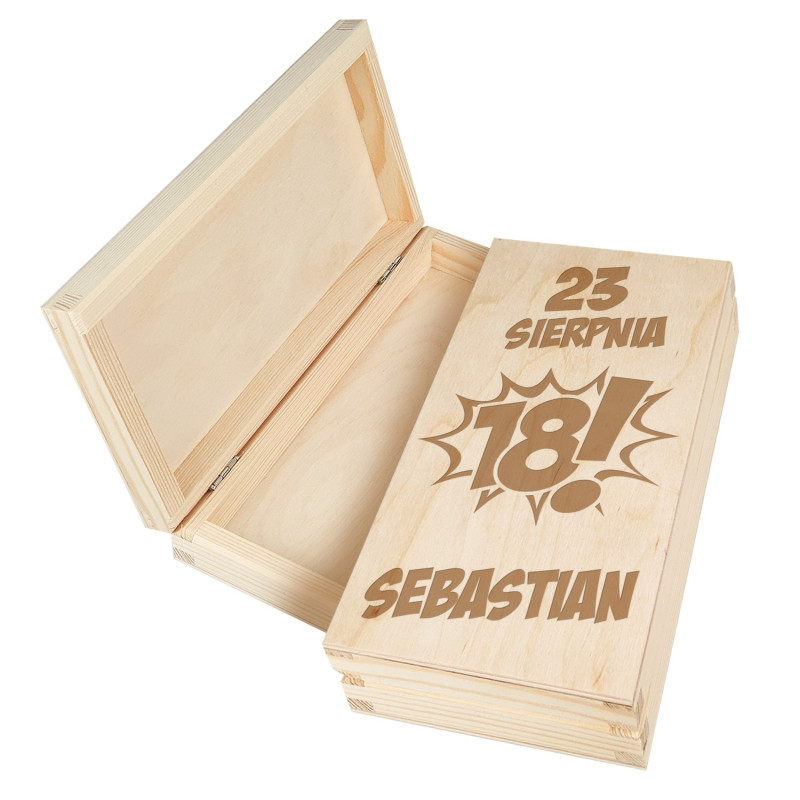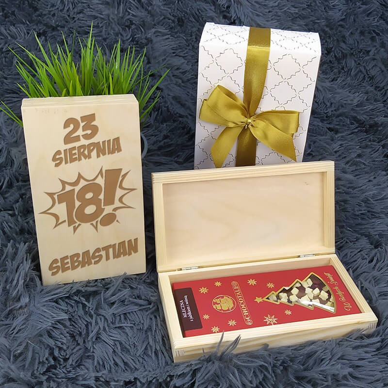Świetnie sprawdzi się jako prezent dla 18 latka. Personalizowany grawer będzie wspaniałą pamiątką, którą na pewno młoda osoba zapamięta na długo. Zabawna, wygrawerowana grafika oraz imię spodoba się każdej młodej osóbce. Pudełko pomieści pieniądze oraz czekoladę.
