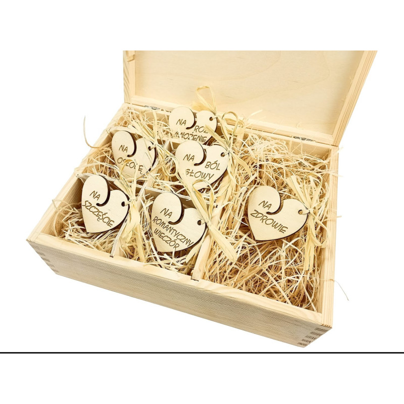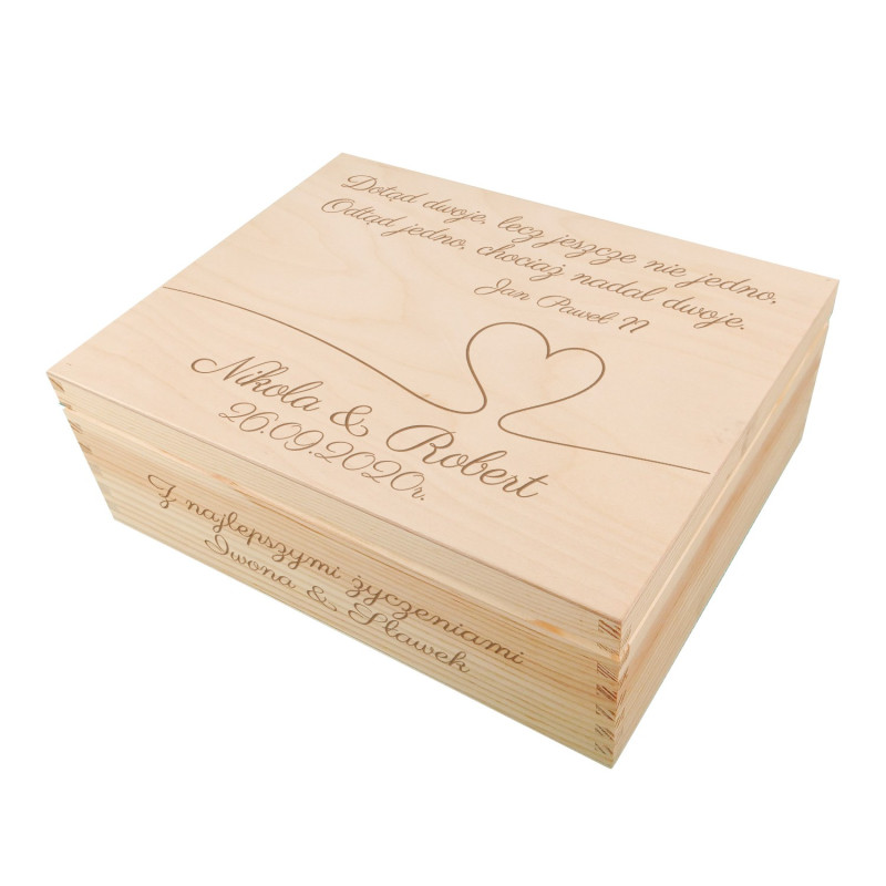 "Dotąd dwoje choć jeszcze nie jedno, odtąd jedno chociaż nadal dwoje" J.PII Świetna szkatułka na ślub. Na wieczku życzenia. Wewnątrz przegródki do umieszczenia śmiesznych przedmiotów związanych z wejściem w związek małżeński. Pudełko wyścielone jest wiórkami drzewnymi. Etykietki drewniane mają zawiązane słodkie kokardki. Do pudełka pakujesz drobne gadżety i prezent na ślub, a zarazem pamiątka na całe życie gotowy.