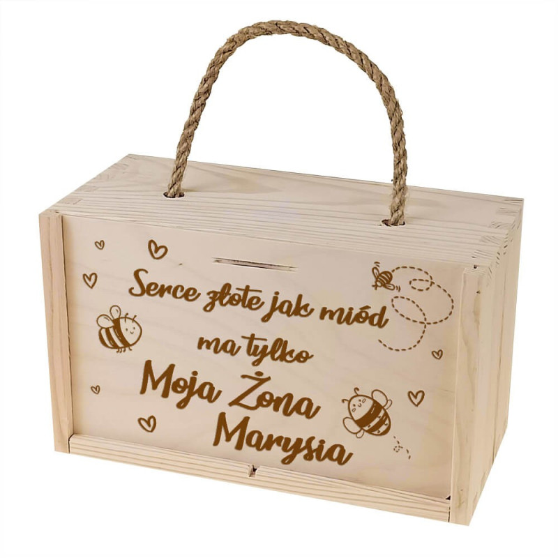 Pudełko drewniane na 2 słoiczki miodu z grawerem dla niej - serce złote jak miód.