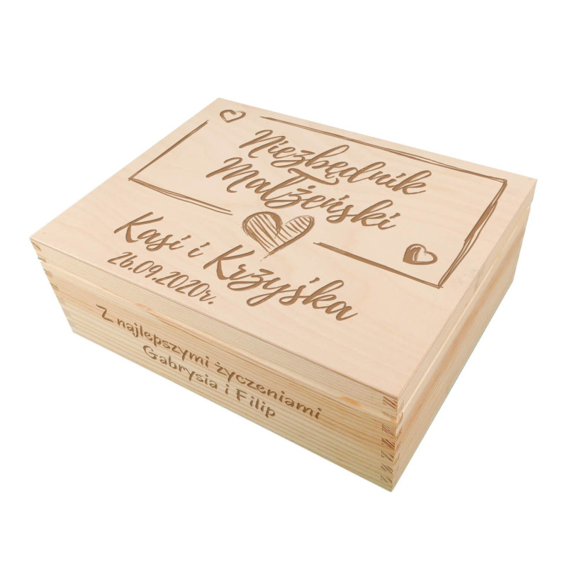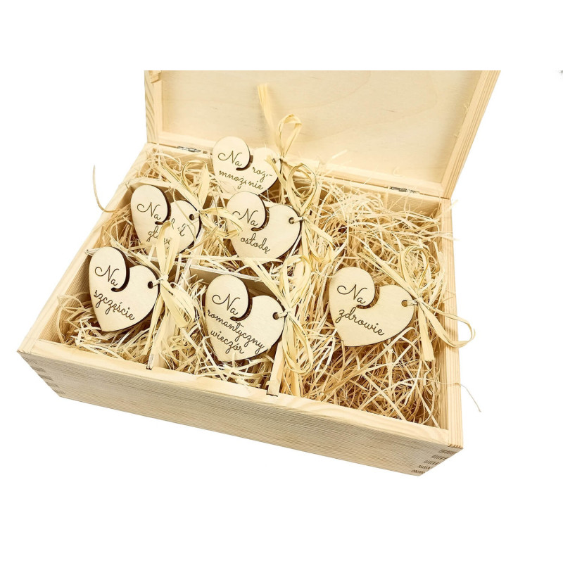 Świetna szkatułka na ślub. Z boku pudełka życzenia. Wewnątrz przegródki do umieszczenia śmiesznych przedmiotów związanych z wejściem w związek małżeński. Pudełko wyścielone jest wiórkami drzewnymi. Etykietki drewniane mają zawiązane słodkie kokardki. Do pudełka pakujesz drobne gadżety i prezent na ślub, a zarazem pamiątka na całe życie gotowy.